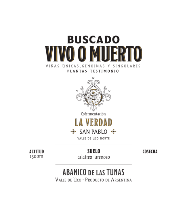 Buscado Vivo o Muerto was born of the drive to produce unconventional wines. Wine exploring marginal, often forgotten terroirs. Vineyards with singular soils and unconventional varietals. The search was long, extensive, tireless, and often frustrating. It led them to the far southern Uco Valley in Las Pareditas and high in the Andean foothills to discover the subtleties of Gualtallary. They went in pursuit of something evasive, difficult to define. But Alejandro Sejonovich and Jeff Mausbach persevered - determined to find it, DEAD OR ALIVE.